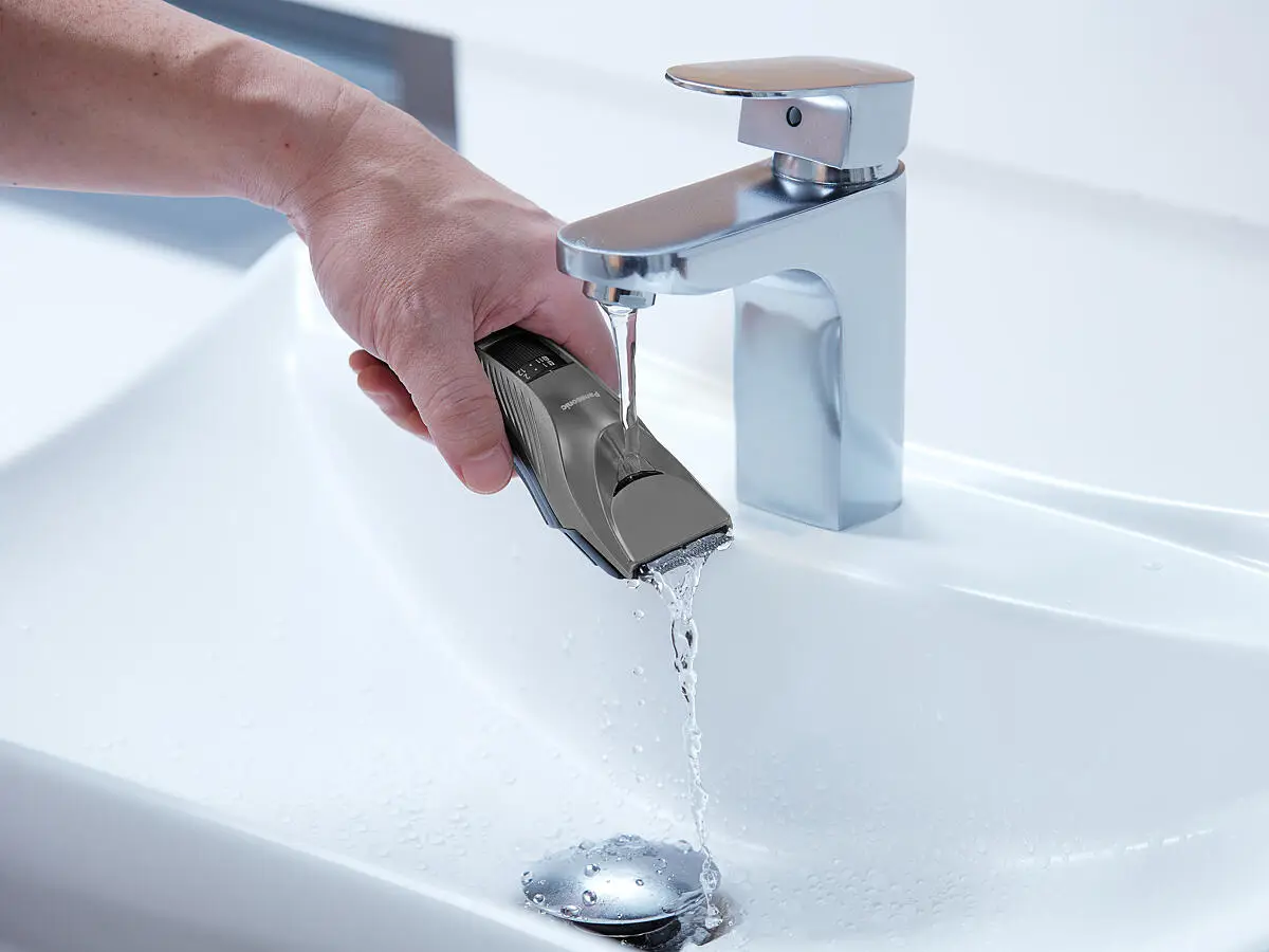 Designul rezistent la apă îți permite să clătești mașina de tuns sub jet de apă pentru o întreținere ușoară și igienică. Notă: Înainte de a-l spăla, î...