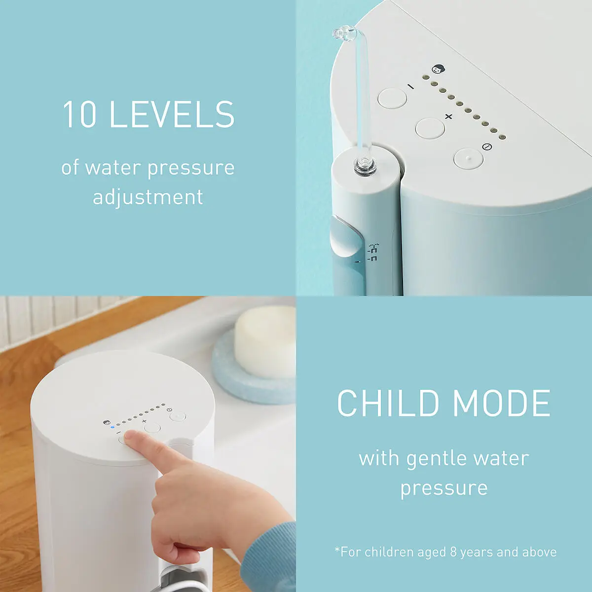 Presiunea apei poate fi reglată pe 10 niveluri. Nivelul 1 este modul pentru copii, care asigură o îngrijire amănunțită cu o presiune delicată a apei care nu provoacă durere la nivelul dinților sau gingiilor, ceea ce îl face sigur chiar și pentru copii.