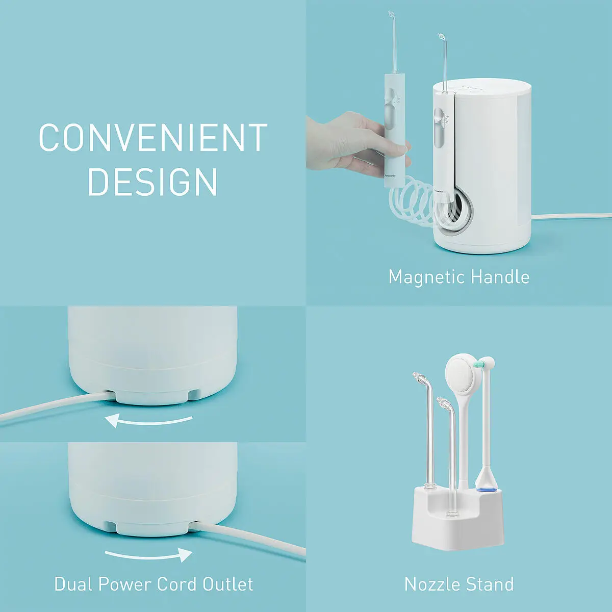 Include două duze cu ultrasunete, o duză ortodontică și o duză pentru îngrijirea limbii. Diferitele duze permit o îngrijire orală care vizează nevoi specifice. Achiziționați duze suplimentare în funcție de mărimea și nevoile familiei dvs.