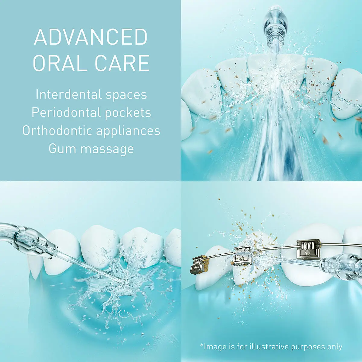 Combinația dintre un jet de apă și capul de periuță integrat permite îndepărtarea ușoară a plăcii și a resturilor alimentare de pe aparate și punți ortodontice.
