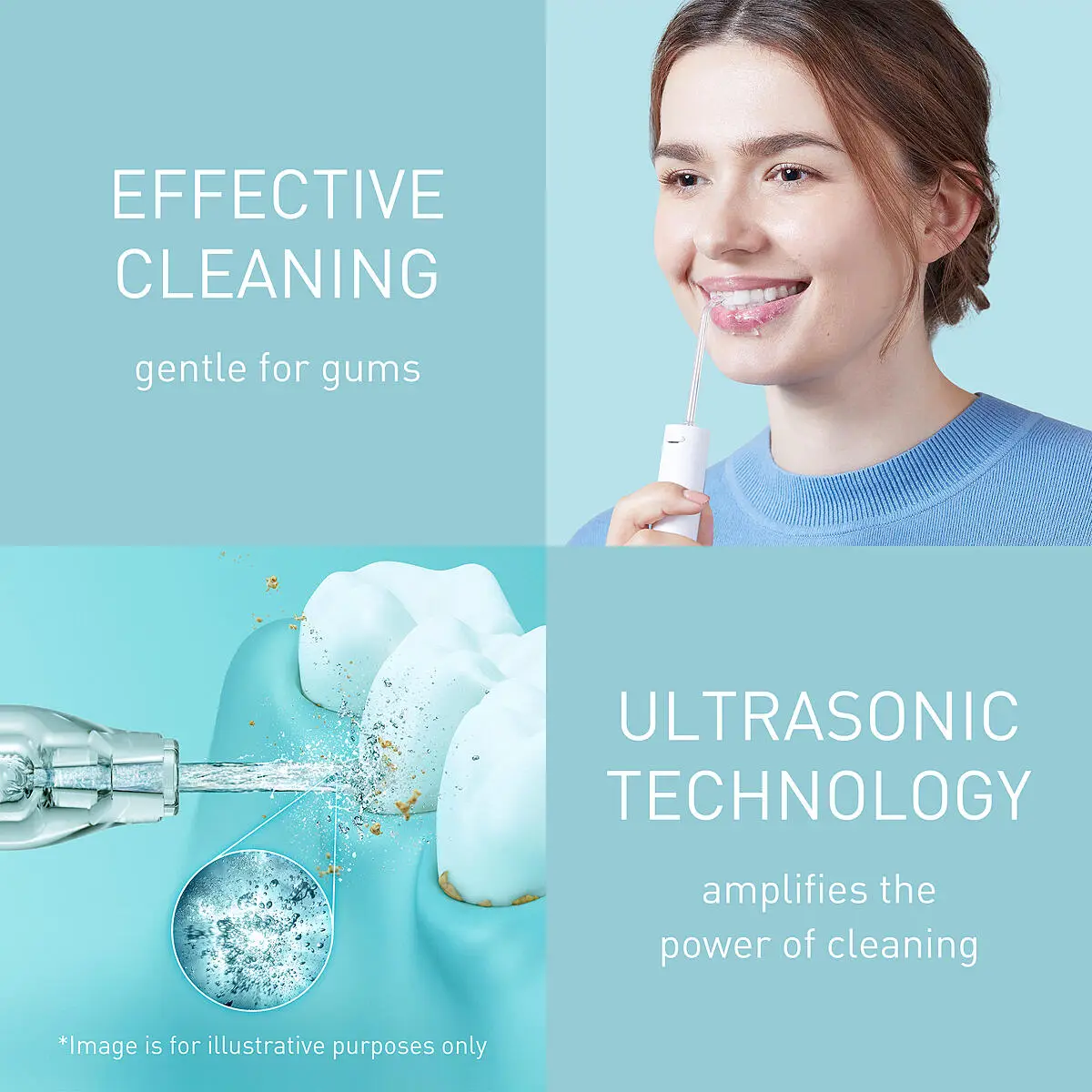 Ajungeți cu ușurință în spațiile dintre dinți pentru a îndepărta resturile alimentare cu ajutorul jetului puternic de apă cu ultrasunete.